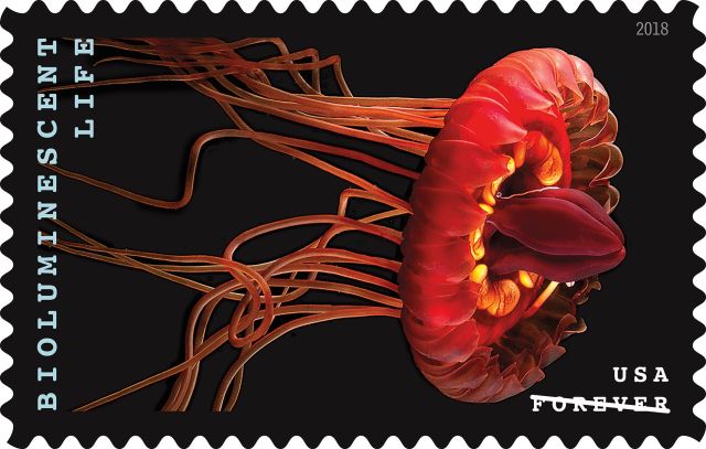 Биолюминесцентные формы жизни изображены на черном фоне. На листе также в качестве дополнительного декора видны полупрозрачные медузы. Но основная соль этой серии в следующем. По данным Почтовой службы США, марки были изготовлены с использованием голографического материала, способного необычайно сильно отражать белый свет, чтобы тем самым «передать ощущение движения». Так что, как видим, USPS продолжает нас удивлять (вспомним прошлогоднюю серию о Лунном затмении с теплочувствительными чернилами)