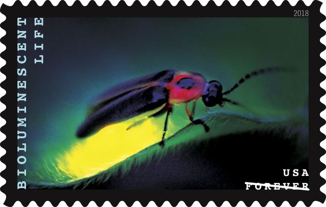 В глубине океана во мраке ночи есть живые существа, большие и малые, излучающие собственный свет. Новая серия безноминальных марок США посвящена именно им. Ареал животных, изображенных на марках, включает как маленького светлячка, так и огромного глубоководного осьминога, а наземная флора представлена небольшим скоплением грибов, излучающих призрачный зеленый свет. Биолюминесценция - это производство света живым организмом посредством химической реакции. Такое свечение служит в качестве приманки, отпугивания хищников или подачи сигналов. В случае светящегося гриба теория гласит, что так грибы привлекают насекомых, которые могут помочь распространить споры грибов.