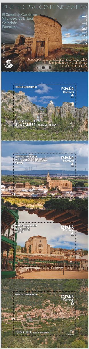 Выпуск будет состоять из 4 самокляющихся марок и виньетки в виде сцепки, сложенной гармошкой, в стиле старых открыток. На этот раз выбраны города: Вильянуэва-де-ла-Хара в Куэнка, Чинчон в Мадриде, Форналукс в Ильес-Балерах и Эль-Кастель-де-Гвадалест в Аликанте.