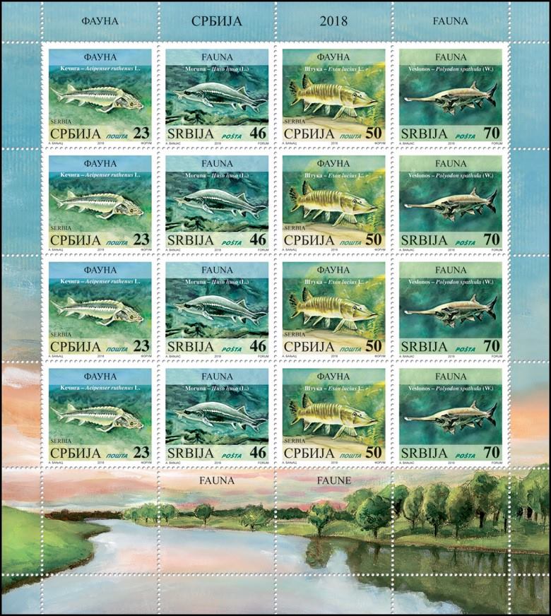 На марках - рыбы чистых рек Сербии Дунай, Тиса, Морава, Сава.