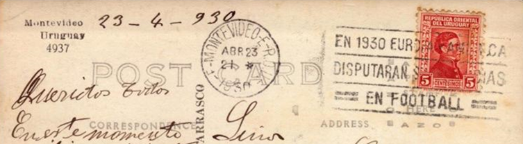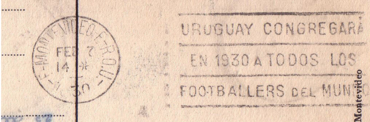 В своей статье сеньор Хуан Б. Оберти демонстрирует и этот конверт для авиапочтовых отправлений, рекламирующий 2 события огромной важности для Уругвая: 100-летие независимости и предстоящий чемпионат мира, и описывает его так: «Неизвестно, была ли это частная инициатива, или она была выпущена и санкционирована почтой, или другой организацией, поддерживающей оба события. Футбольную часть конверта дополнена аллегорией, изображающей самолёт и заходящее над холмом Сьерро-де-Монтевидео солнце. Прекрасная вещь, придающая блеск не только коллекциям аэрофилов, но и собраниям на футбольную тематику». Мне удалось выяснить, что конверт был изготовлен в начале 1930 года бразильской авиакомпанией NYRBA (New York, Rio and Buenos Aires Line).