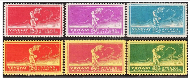 Серия, посвященная победе сборной Уругвая по футболу на VIII Олимпийских играх в Париже (1924 г.). Верхние 3 марки - на белой бумаге, нижние - на «жёлтой».
