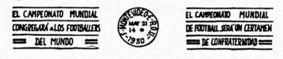 «Двойной» - с двумя текстами в прямоугольниках слева и справа и датой отправления в круге в середине: EL CAMPEONATO MUNDIAL CONGREGARA a LOS FOOTBALLERS DEL MUNDO / EL CAMPEONATO MUNDIAL DE FOOTBALL SERA UN CERTAMEN DE CONFRATERNIDAD / ЧЕМПИОНАТ МИРА СОБЕРЁТ ФУТБОЛИСТОВ МИРА / ЧЕМПИОНАТ МИРА ПО ФУТБОЛУ БУДЕТ СОРЕВНОВАНИЕМ БРАТСТВА.