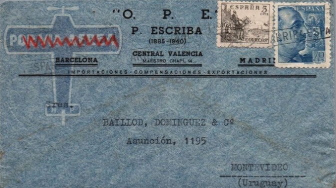 Уругвайские штемпели 1937 г. (реконструкция) и 1942 г. (на авиапочтовом отправлении Испания – Уругвай. Фото ebay)