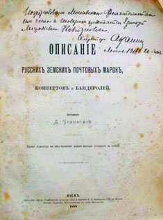 В 1888 г. в Киеве вышла книга Д.Н. Чудовского «Описание русских земских почтовых марок, конвертов и бандеролей», которая обрела популярность среди тогдашних филателистов – это был своеобразный справочник по земской филателии на русском языке, на 155 страницах, включавший земские марки, известные к тому времени. Из описания: «Алфавитный указатель по губерниям и уездам в алфавитном порядке. Для глубокого изучения земских марок». Цель издания: «Чтобы выяснить деятельность земских управ по предоставленному им праву устраивать земские сельские почты. Чтобы предоставить русским собирателям земских почтовых марок иметь, на отечественном языке, полное к тому руководство». Автор книги даёт определение филателистам, называет их «маркоманами» и, хотя, сам имеет определённое отношение к филателии, скорее относится к ней, как к пустой забаве: «Маркомания, несомненно, психическая болезнь нашего века. Страсть к собиранию весьма различных предметов всегда существовала в человечестве. Собирали коллекции: книг, гравюр, монет, животных, растений, оружий, одежды и проч., и проч., но собирать почтовые марки всех государств и всех образцов, с малейшими их оттенками начали только лет двадцать тому назад… Этой болезнью страдают теперь уже несколько сот тысяч народа на всём земном шаре, и немцы вздумали эту страсть, эту болезнь возвести даже в науку, назвав её мудрёным словом «Filatelia». В России, к счастью, маркоманов, сравнительно с Англией, Германией и Францией, ещё мало, хотя в С-Петербурге и Москве уже образовались общества любителей марок». |