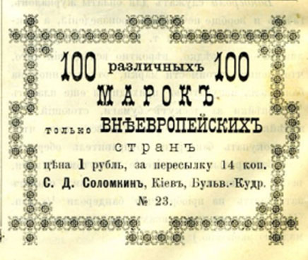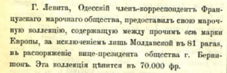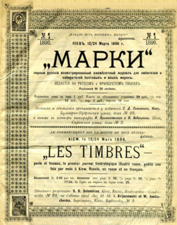 Первый в Российской империи филателистический журнал «Марки» издавался в Киеве с 1896 по 1901 гг. на русском и французском языках. Начиная с 3-го номера в 1896 г. журнал перешёл под эгиду Московского общества собирателей почтовых марок (вплоть до ликвидации общества в 1898 г.), а с 1898 по 1901 гг. был органом Киевского кружка коллекционеров почтовых марок (включал до 25 человек) и выходил в этот период на русском. История сохранила фамилию редактора – Соломкин Сергей Данилович – торговец марками. Стоимость годовой подписки – 1 руб. или 2 руб. на лучшей бумаге. Вначале журнал издавался в крупном формате, затем, одновременно с уменьшением формата стало постепенно выдыхаться и содержание его. Кроме Киева и Москвы журнал имел подписчиков в столичном Санкт-Петербурге и других городах, но выходил нерегулярно (по информации из Википедии). На страницах издания рассказывалось о филателистических новинках, были переводы серьёзных статей об истории почтовых марок разных стран, освещалась филателистическая жизнь в Российской империи, особенно – земская почта, была информация о выходящих тогда почтовых карточках с изображениями городов, а также новости про филателистическую жизнь в Киеве и Одессе. «За Одессу» есть новости уже во 2-м номере журнала «Марки» за 1896 г. - заметка об одном одесском коллекционере марок: |
