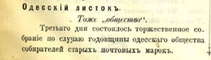 Кроме того, в том же номере опубликована заметка неизвестного автора из газеты «Одесскій листокъ» о годовщине одесского общества собирателей марок. Редактор журнала перепечатал публикацию одесского фельетониста В.М. Дорошевича, без указания фамилии автора, наверно, чтобы не выплачивать гонорар: