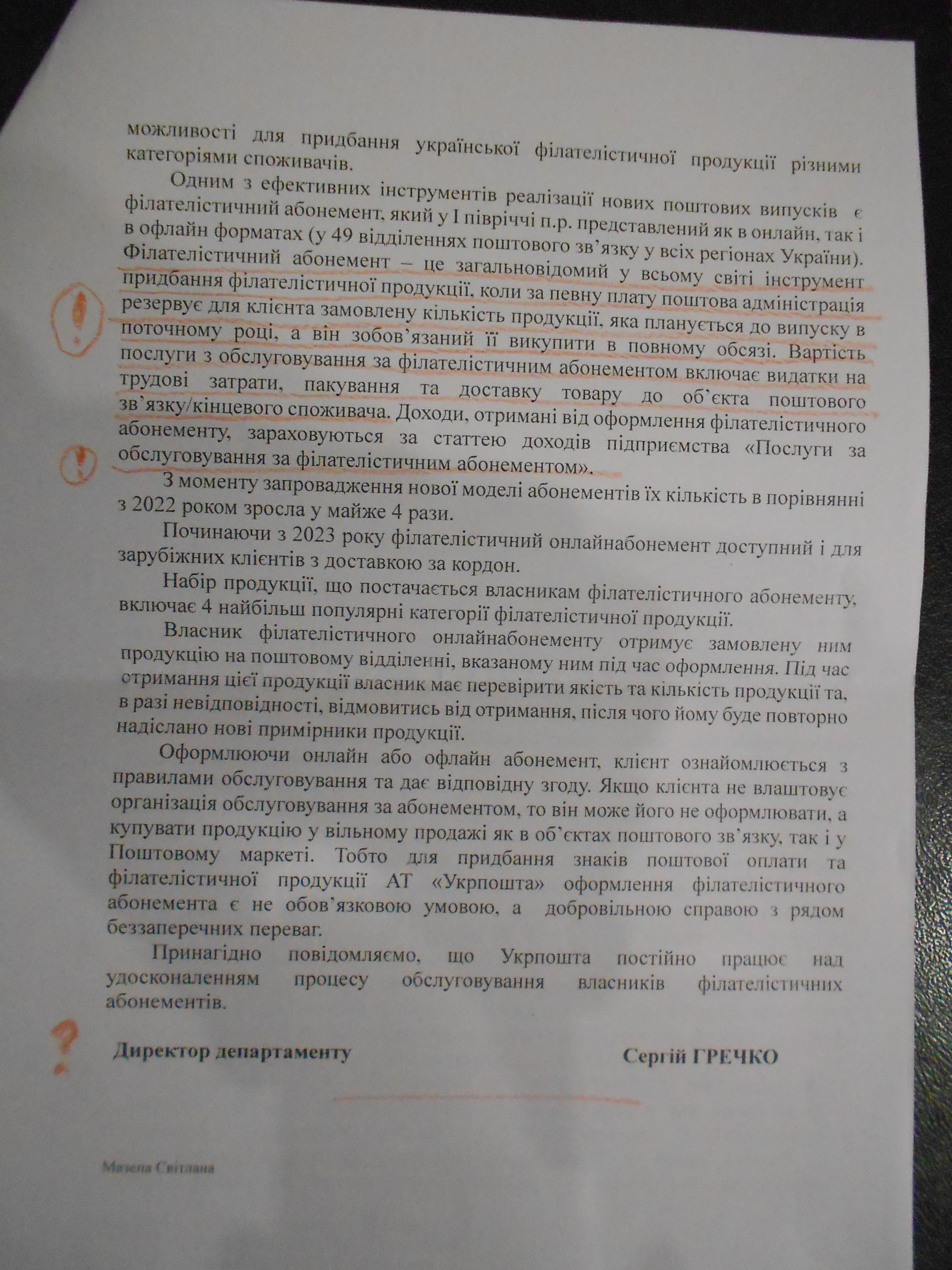 Вчора Я отримав відповідь УКРПОШТИ . Мій коментар - без Мене Мене оженили . Може це тепер нові віяння , що листи не треба підписувати . А головне - без нашого відома тишком - нишком пройшов перехід Публічного акціонерного товариства в приватне акціонерне товариство . Нас - потенційних акціонерів УКРПОШТИ - знову , фактично , обікрали . Державна власність , яку будували і накопичували всі громадяни України своїми виплаченими налогами і за ці кошти будувалася ця власність УКРПОШТИ , фактично кимось привласнена без нашого відома . Це продовження розкрадання стратегічних активів української держави . Деребан продовжується . Про питання філателії - Я підкреслив червоним кольором . Чекаю на Ваш коментар . Найкращі побажання . З повагою , Олександр Алін .