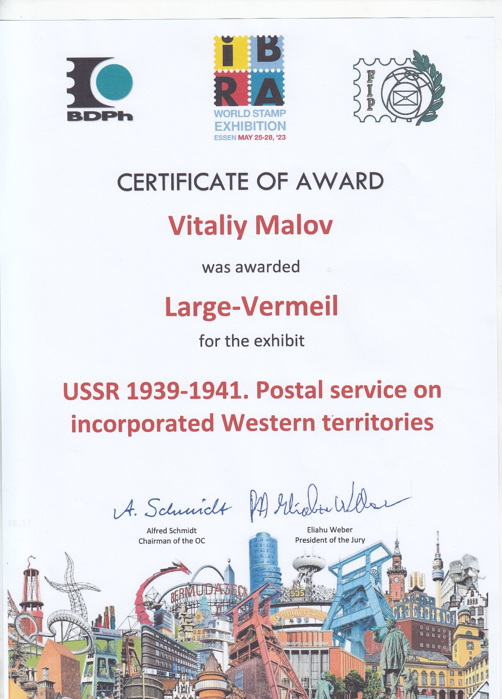 В этом году я немного переделал свой экспонат «USSR 1939-1941. Postal service on incorporated Western Territories”, добавил в него некоторое количество редких и необычных писем и других почтовых документов периода Второй мировой войны и получил оценку жюри 86 баллов и Большую Позолоченную медаль. Это заметный шаг по сравнению с Индонезией-2012, когда оценка была (если не ошибаюсь) 80 баллов.