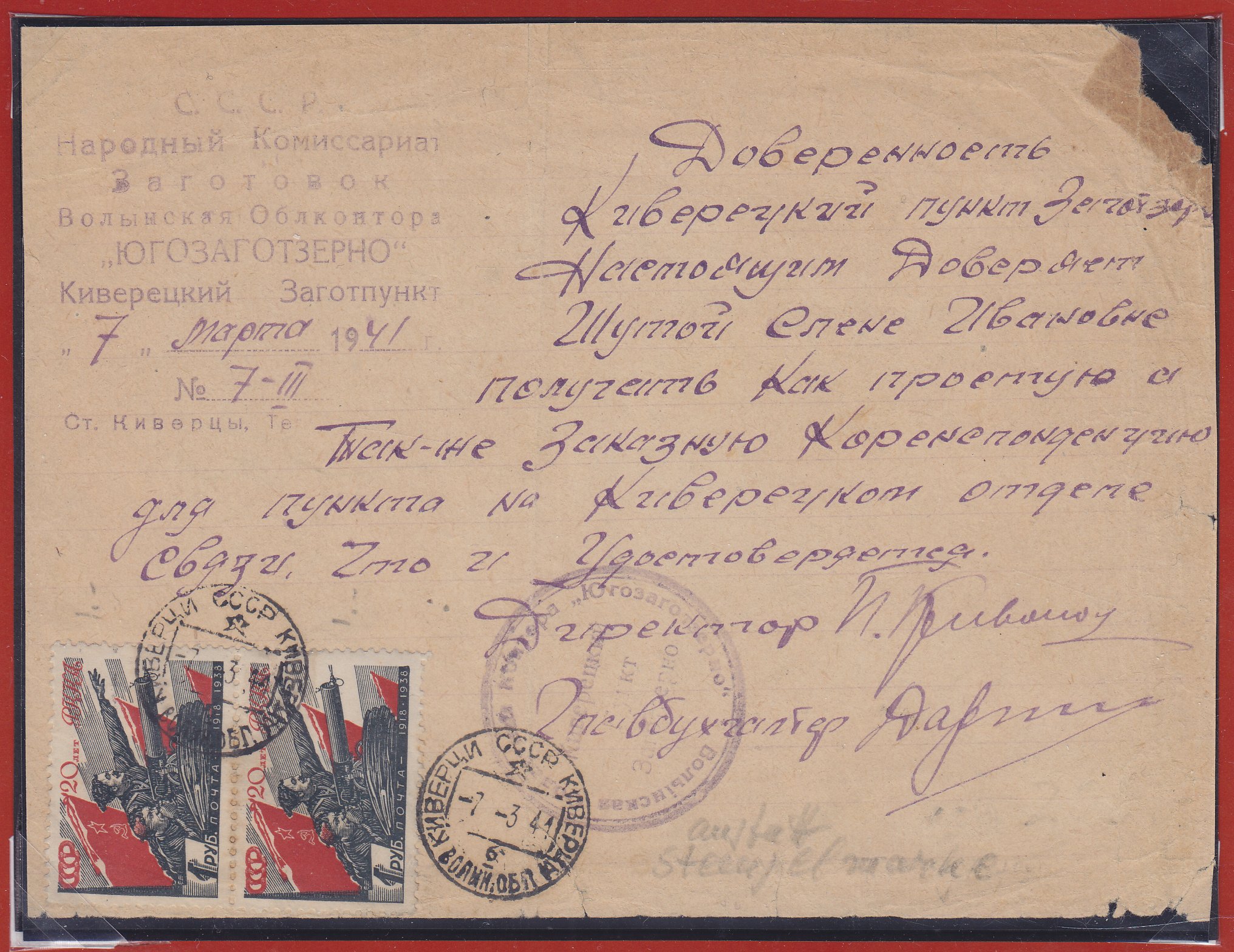 Киверцы, Волынская область, Западная Украина. 1941. Использование почтовых марок СССР (2*1руб) для оплаты не почтового сбора, а нотариальных услуг – для оформления доверенности. Я знаю только о двух вещах с таким необычным использованием почтовых марок на оккупированных территориях