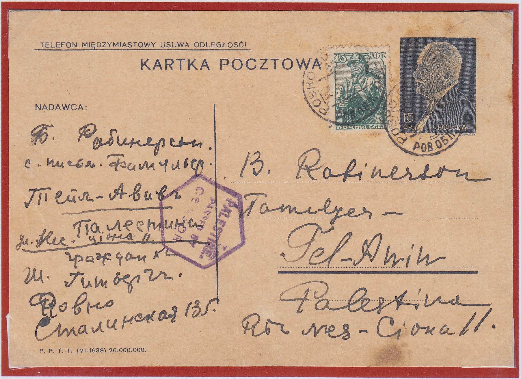 Ровно в Тел-Авив, Палестина. 1940. Смешанная польско-советская франкировка по тарифу 30 коп. Для международной карточки (15 грошей на открытке + 15 копеек на марке). Британская военная цензура.