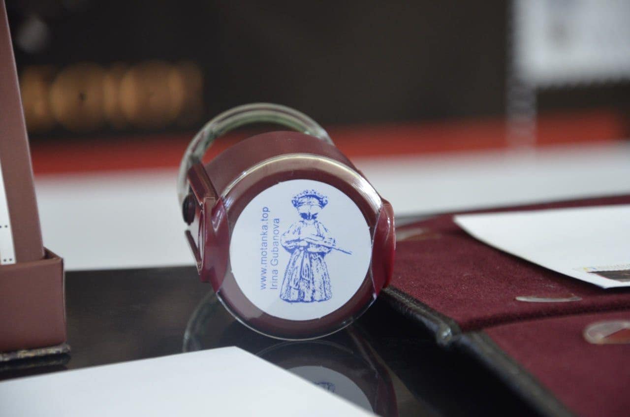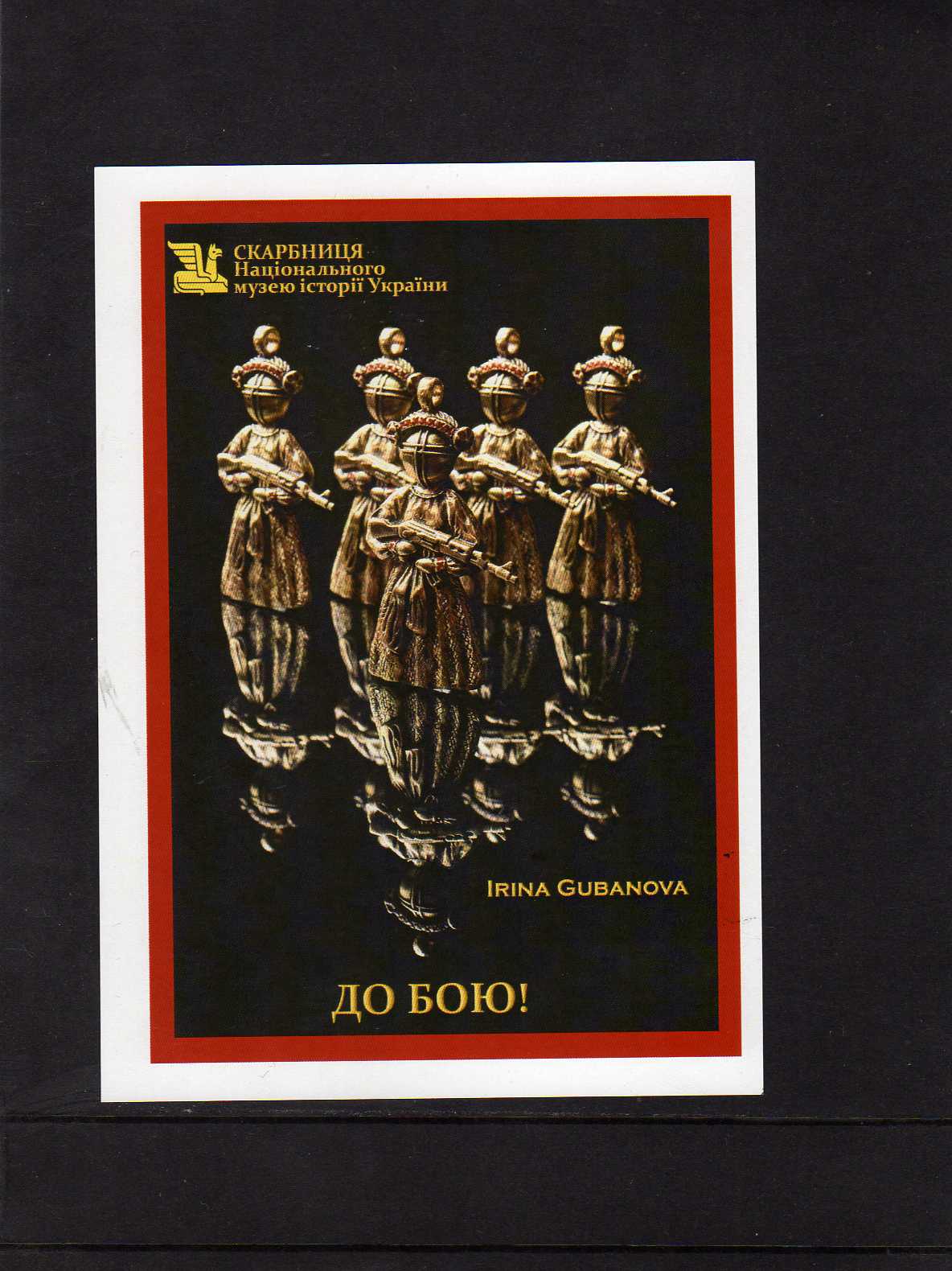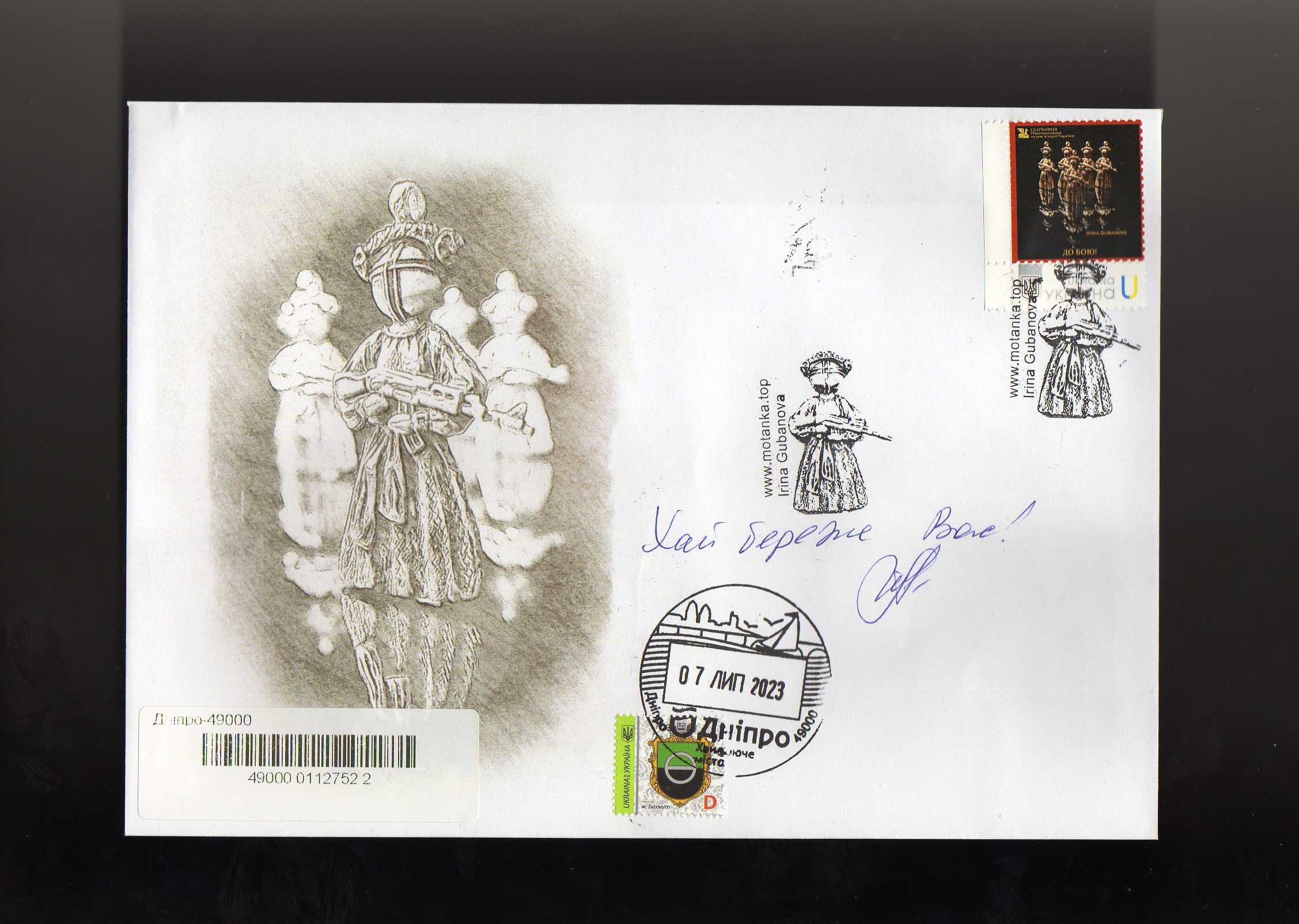 На ній зображена невеличка скульптура – лялька-мотанка з автоматом в руках. Сакральний образ берегині, матері, захисниці, доповнений сучасною зброєю. Для захисту рідної землі. Авторка – наша землячка, дніпрянка Ірина Губанова.