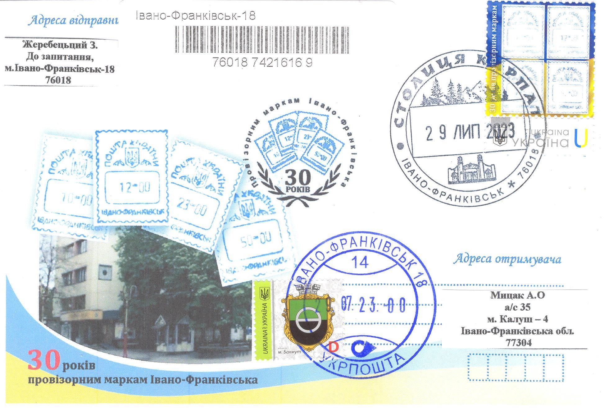 На підставі дозволів Міністерства зв’язку та ВО «Івано - Франківськзв’язок» від 23 червня1993 року, наказу № 108 по Івано – Франківському поштамту від 19 липня1993 року було виготовлено поштові марки з написом « ПОШТА УКРАЇНИ. ІВАНО-ФРАНКІВСЬК » за малюнком художника Петра Прокопіва. Штемпель для друку марок, розміром 22 × 28 мм, мав форму прямокутника з зубцівкою. Друк провізорних марок номіналом 10-00, 12-00, 23-00 і 50-00 крб. був здійснений за допомогою відтиску штемпеля на смужці стрічкового паперу в рулонах шириною 26 мм з одного кліше із змінним номіналом. Марки надруковані синьою фарбою особливого кольору з домішкою порошкоподібного металу. В обіг марки надійшли до операційного вікна Івано-Франківського поштамту 29 липня 1993 року. Цій події був присвячений художній немаркований конверт, власна марка і каше: