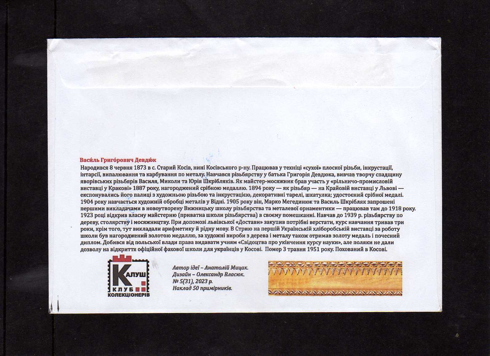 Філателісти Калуша відзначили 150-ти річчя від дня народження Василя Григоровича Девдюка випуском художнього немаркованого конверту (дизайн Олександра Власюка).