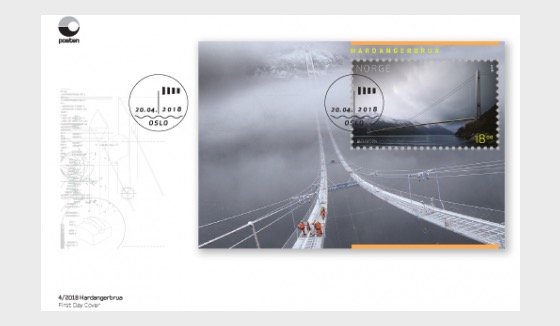 На марке Норвегии номиналом 18 крон представлен Хардангерский мост — висячий мост, переброшенный через Хардангер-фьорд на юго-западе Норвегии. Он пришёл на смену паромному сообщению, став частью кратчайшего пути между Осло и Бергеном. Мост является самым длинным в Норвегии. Длина моста - 1380 метров, а главного пролёта - 1310 метров. Мост имеет один из самых длинных пролётов в мире (№ 10 - в мире и № 1 — в Норвегии). Высота моста над уровнем моря составляет 55 метров. Мост имеет две полосы движения. Мост также поделён на проезжую часть, и на велодорожку/тротуар. Строительство начато в феврале 2009 года, открыт в августе 2013 года.