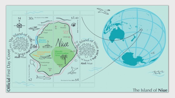 Первое закрытие дня помещает марки в более широкий контекст окружающего океана. Миниатюрный лист первого дня показывает, где крошечный остров Ниуэ расположен на земном шаре.