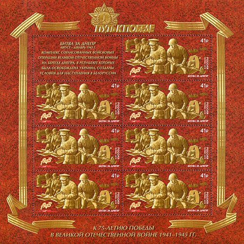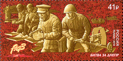 Битва за Днепр — ряд взаимосвязанных стратегических операций Великой Отечественной войны, проведённых во второй половине 1943 года на берегах Днепра. В результате четырёхмесячной операции были освобождены Левобережная и часть Правобережной Украины, Донбасс, Киев, десятки городов и тысячи населённых пунктов, созданы условия для наступления в Белоруссии и полного освобождения Украины. На почтовой марке изображён барельеф с группой советских солдат во время битвы за Днепр.