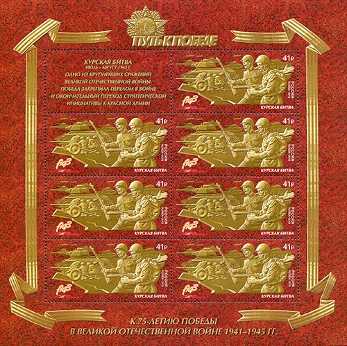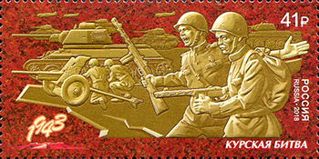 Курская битва (5 июля — 23 августа 1943) является одним из ключевых сражений Великой Отечественной и Второй мировой войн. Сражение было важнейшей частью стратегического плана летне-осенней кампании 1943 года, которая включала в себя: Курскую стратегическую оборонительную операцию (5–23 июля), Орловскую (12 июля — 18 августа) и Белгородско-Харьковскую (3–23 августа) стратегические наступательные операции. Битва продолжалась 49 дней. В результате битвы на Курской дуге была разгромлена группировка немецких войск и ликвидирован занимаемый ею орловский стратегический плацдарм. На почтовой марке изображён барельеф с группой советских солдат во время Курской битвы.