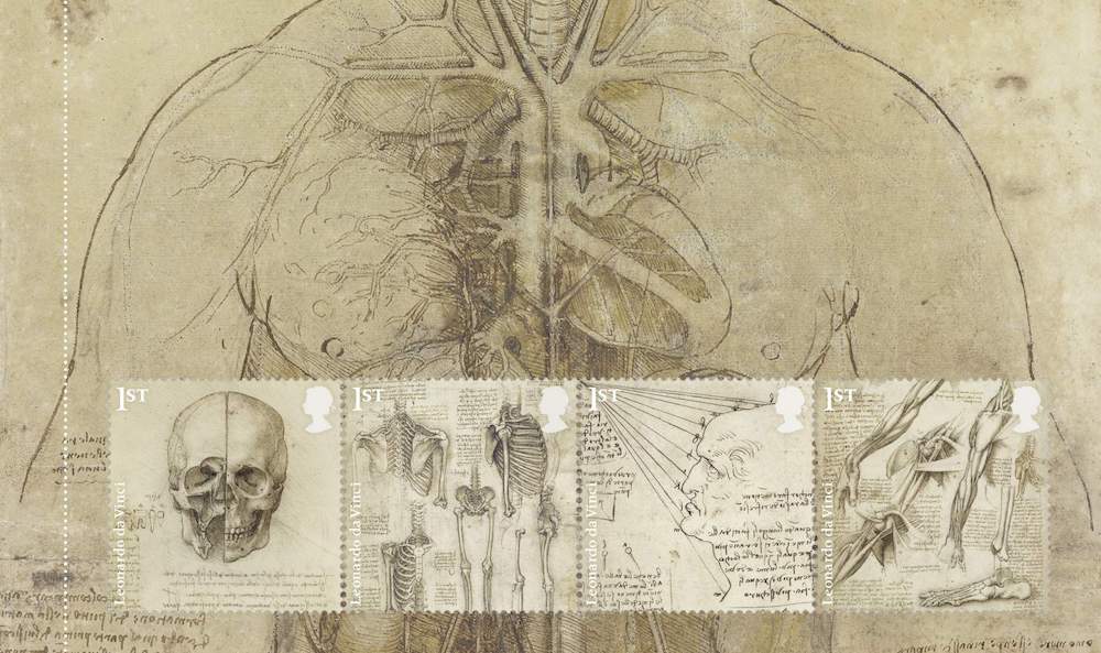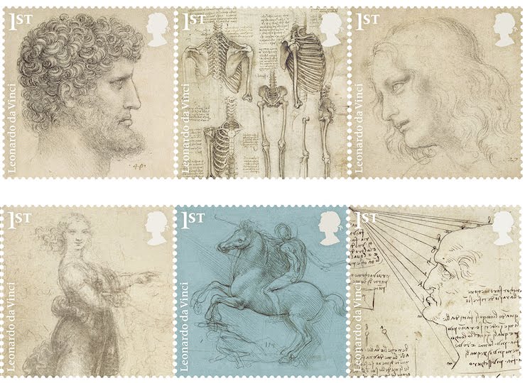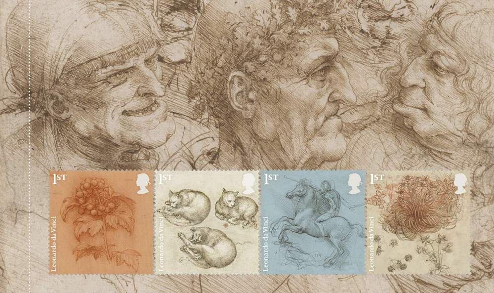 К 500-летию со дня смерти Леонардо да Винчи 144 его лучших рисунка из Royal Collection Trust будут экспонироваться в течение 2019 года в 12 музеях и галереях по всему Соединенному Королевству. В каждом из 12 мест с 1 февраля по 6 мая 2019 года будет организована выставка 12 из этих рисунков, прежде чем все они соберутся вместе на выставке в Королевской галерее в Лондоне. Двенадцать специальных марок этой серии содержат подборку его рисунков из коллекции, приобретенной для королевской коллекции королем Карлом II около 1670 года. Полная коллекция из около 600 его рисунков, хранящихся в Королевской библиотеке в Виндзорском замке, является одной из самых важных в мире и была играла ведущую роль в изучении творчества Леонардо на протяжении веков.