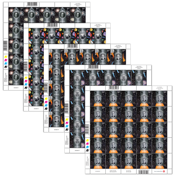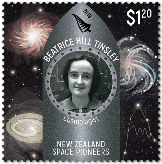 На верхней марке номиналом $1,20 портрет Беатрис Хилл Тинсли (1941-1981). Тинсли родилась в Англии, иммигрировала с семьей в Новую Зеландию после Второй мировой войны. В 1963 году она переехала со своим мужем, физиком Брайаном Тинсли, в Даллас, штат Техас. Она стала первой женщиной-профессором астрономии в Йельском университете в 1978 году. По сообщению новозеландских источников, вокруг портрета методом напыления нанесена метеорная пыль. Пыль видна в виде точек на сером фоне марки.