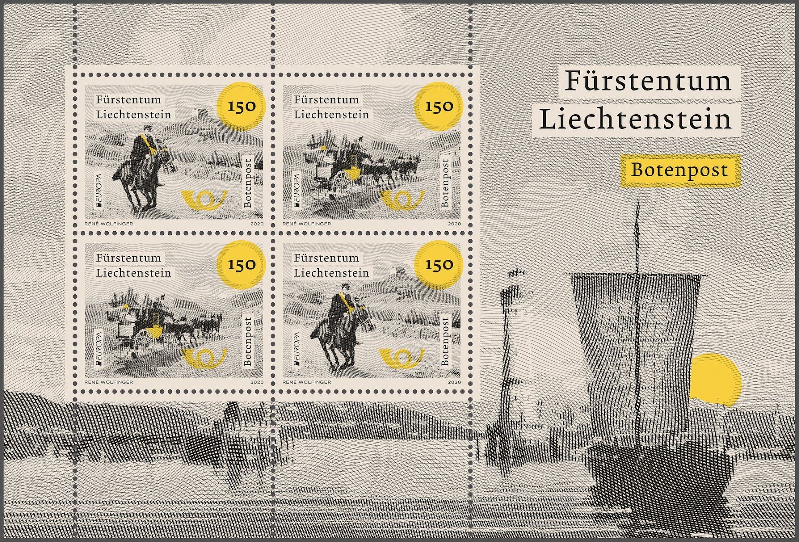 Почта Лихтенштейна 2 марта в рамках совместных выпусков Europa 2020, тема которых в этом году "Древние почтовые маршруты", почта Лихтенштейна ввела памятный лист с 2х2 марками, лейтмотивами которых стали "Дилижанс" и "Верховой курьер" |