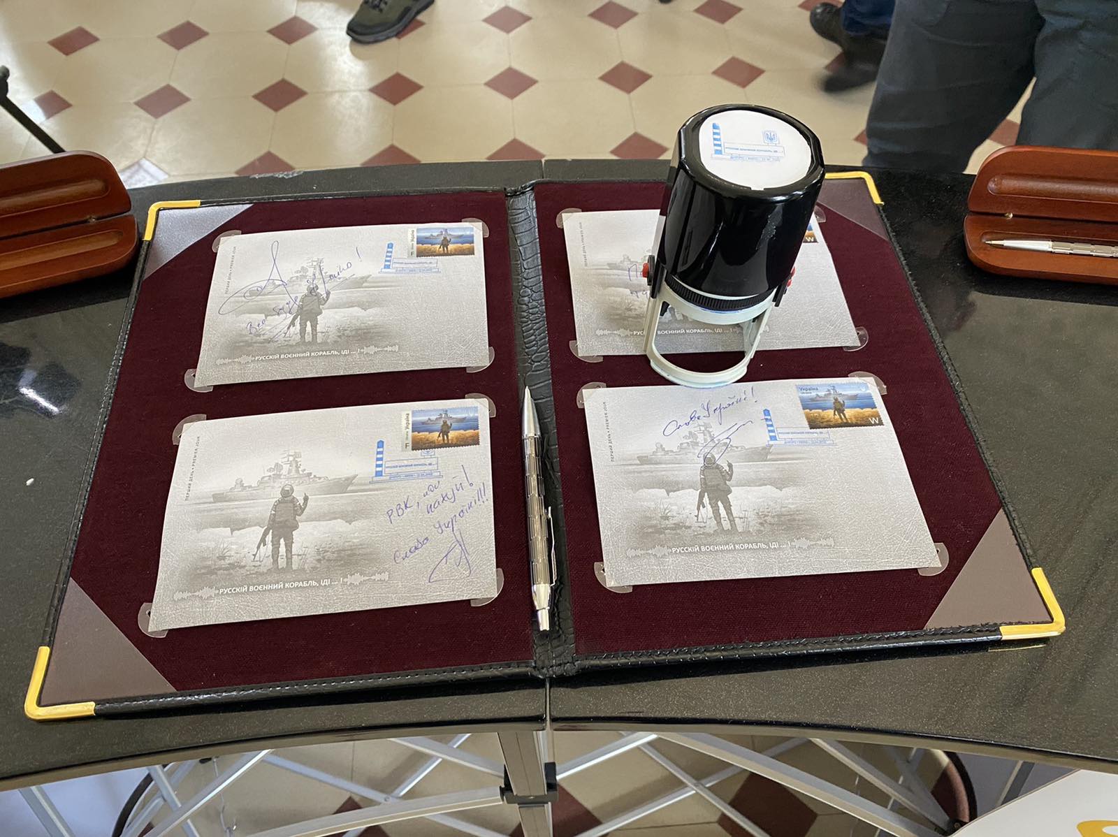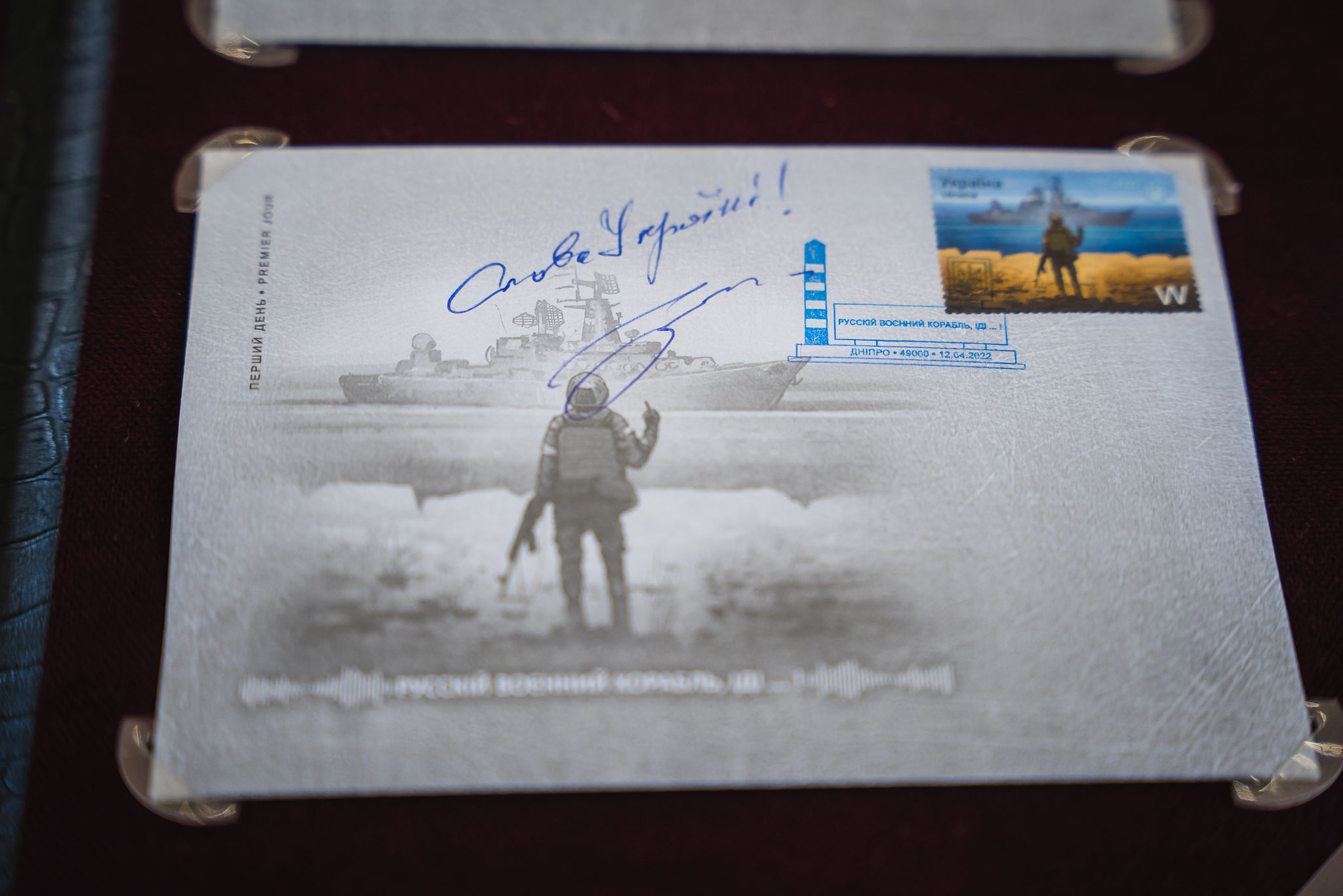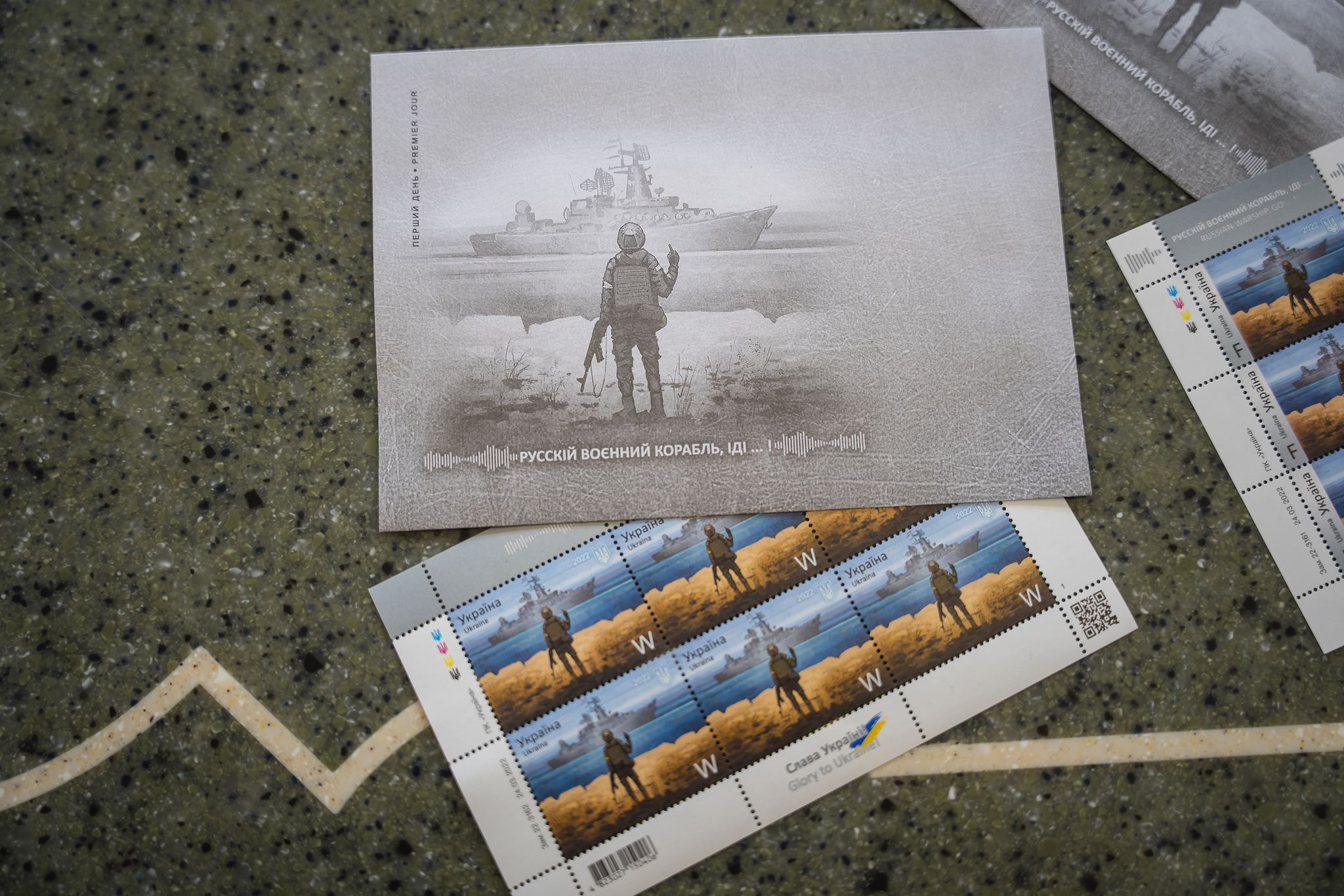 Марку з відповіддю українських прикордонників на острові Зміїний "Русскій воєнний корабль, іді ...!" на вимогу Росії здатися погасили 12 квітня у дніпровській дирекції Укрпошти. Як розповів Суспільному керівник дирекції Димитрій Лісєєнко, зображення на цій марці обирав народ.