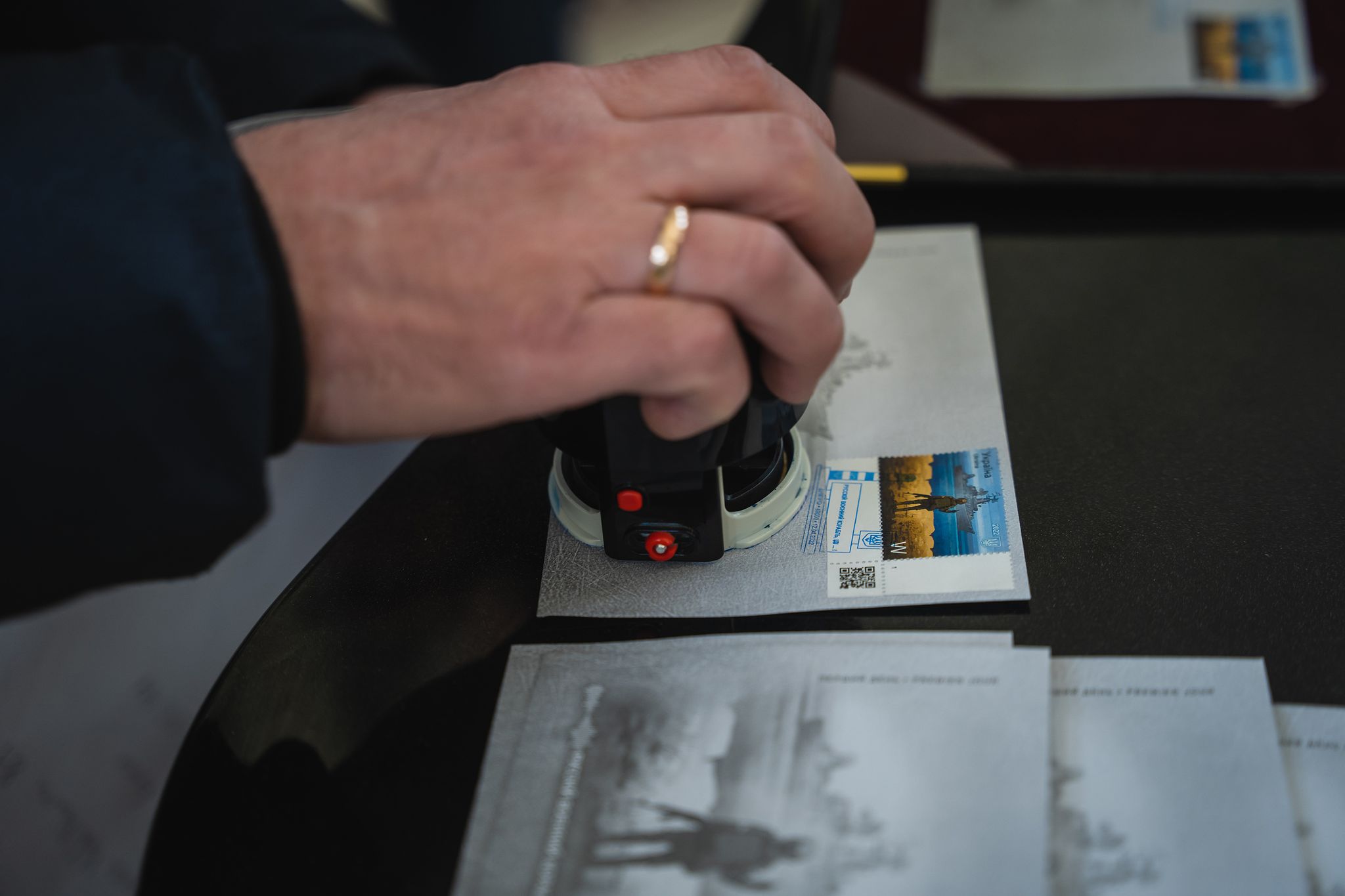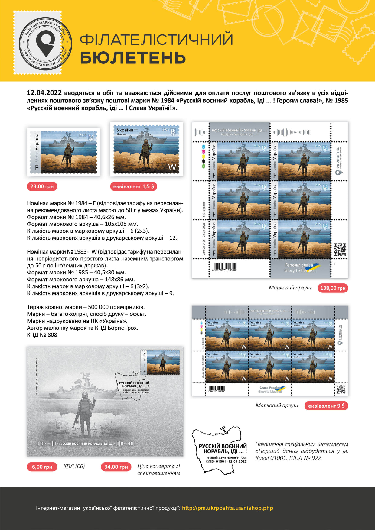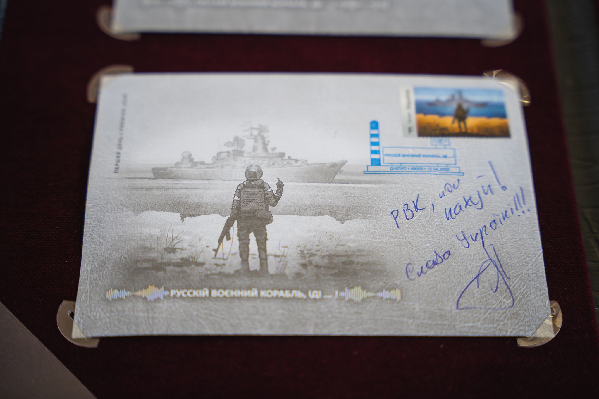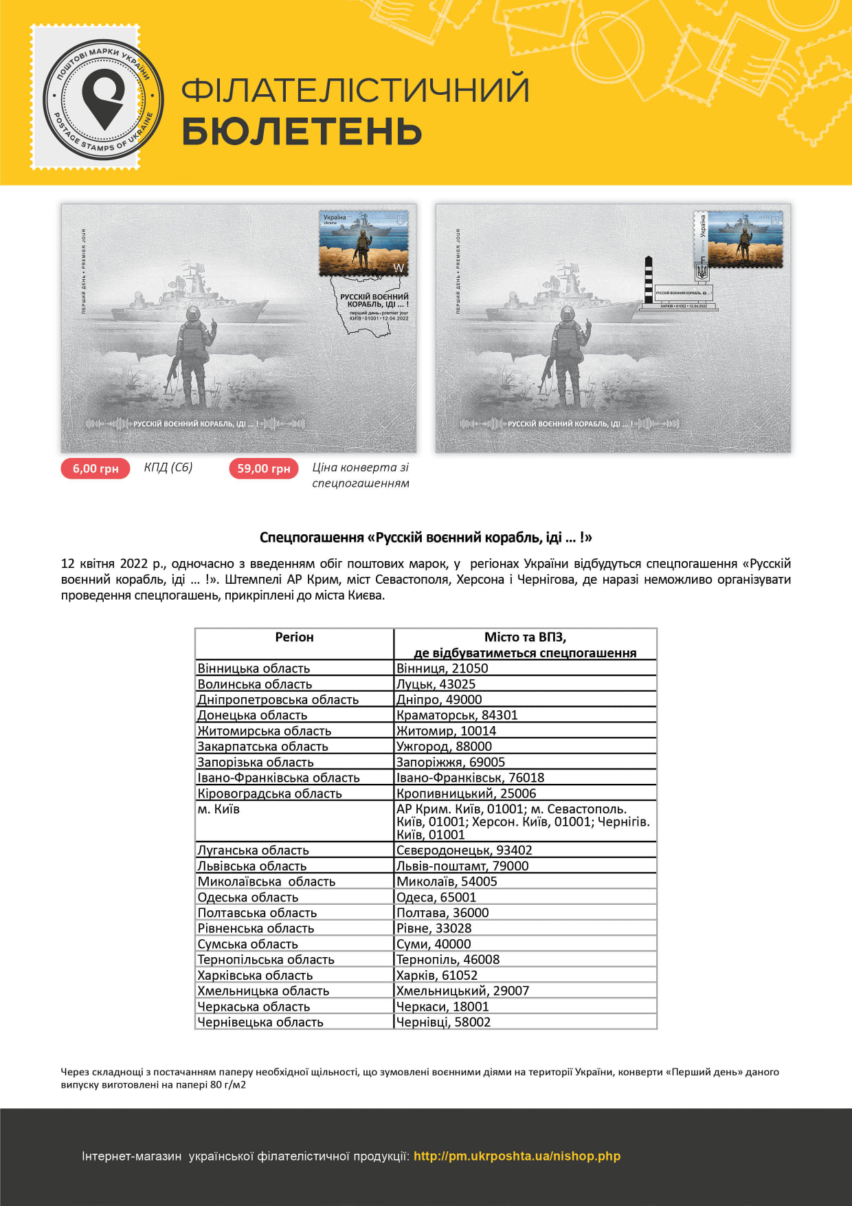Марку з відповіддю українських прикордонників на острові Зміїний "Русскій воєнний корабль, іді ...!" на вимогу Росії здатися погасили 12 квітня у дніпровській дирекції Укрпошти. Як розповів Суспільному керівник дирекції Димитрій Лісєєнко, зображення на цій марці обирав народ.