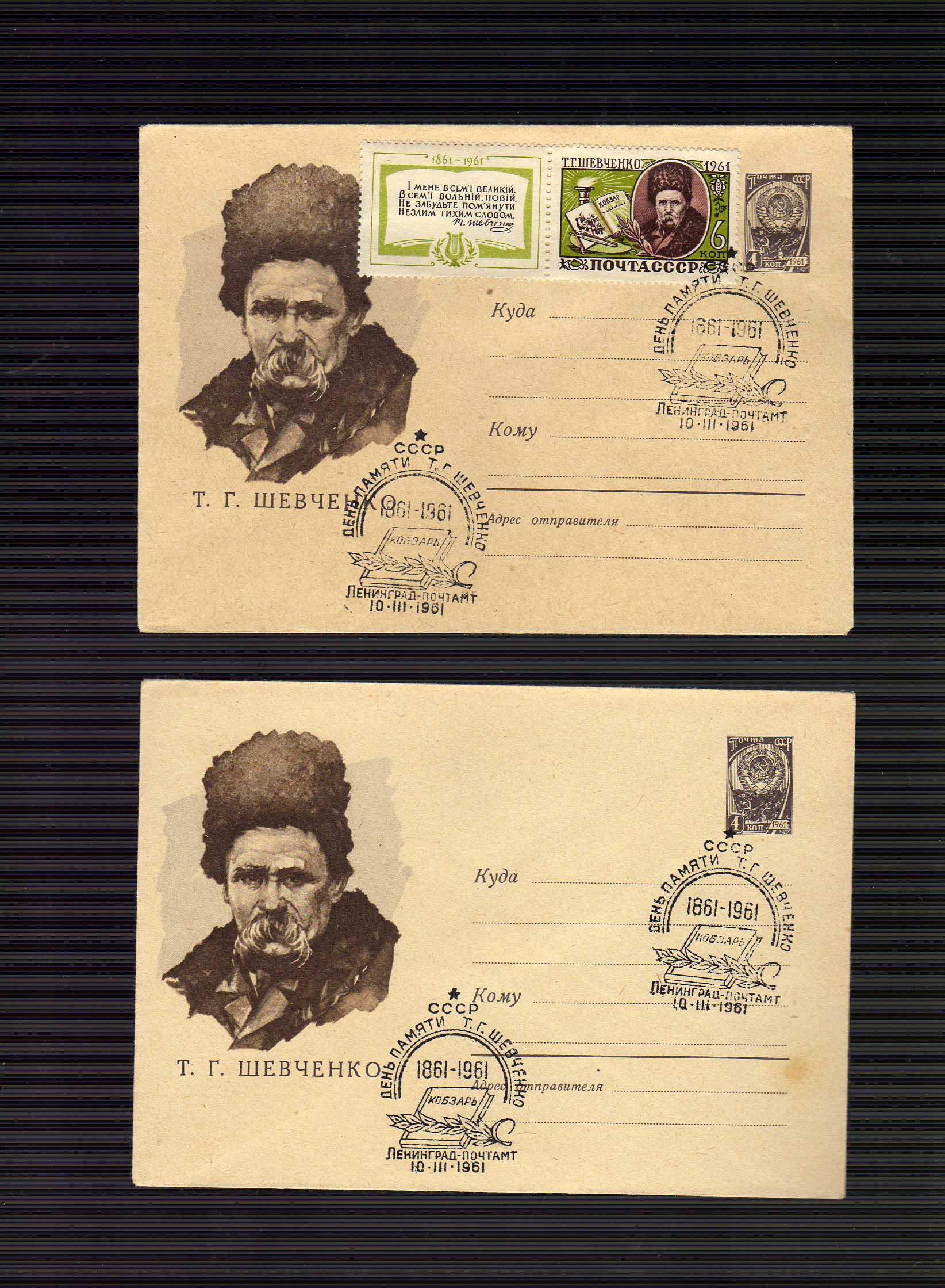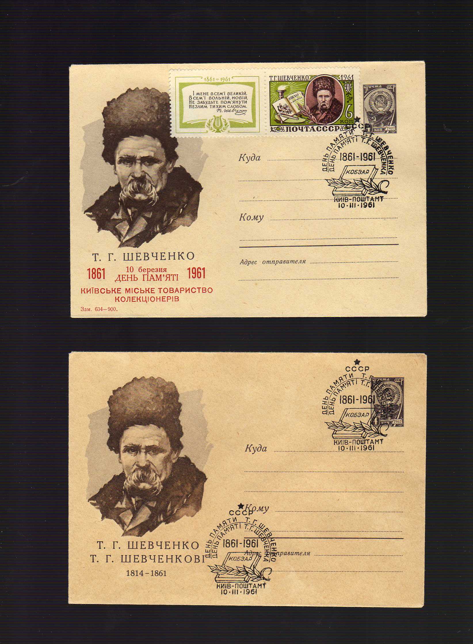 1961г. Четыре конверта посвященные 100 летию со дня смерти Т.Г.Шевченко. По каталогу Лапкина № 61-28 и 61-28-1. Гашения г.Ленинграда и г. Киева. На одном из конвертов печать Киевского общества коллекционеров. Еще один с надпечаткой на украинском языке.
